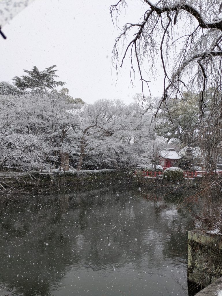 2月8日(日)、三島ではお昼頃からチラホラ雪が降り始め、気が付いたら積もってました。これは大変珍しい。せっかくだから、慣れない雪の中を、足元に気を配りながら、「三嶋大社」と「白滝公園」の写真を撮ってきました。三嶋大社の本殿はそれほどでもなく、神池の厳島神社あたりがきれいでした。